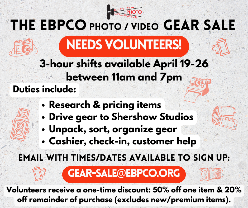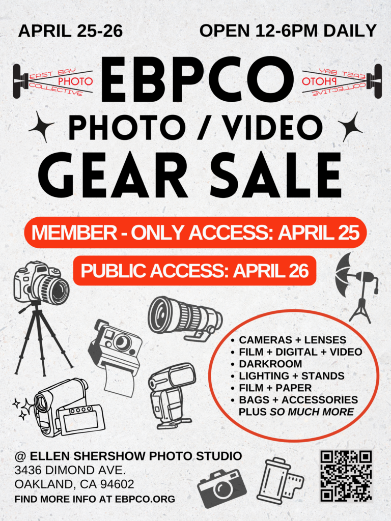 | Announcing the triumphant return of EBPCO’s annual Gear Sale! This two-day affair will feature a wide variety of items generously donated by our community – your purchases will help support EBPCO’s activities (gatherings, workshops, gallery shows, darkroom, and more) throughout the year! DAY 1: Saturday, April 25th, is MEMBER ACCESS DAY: Are you an EBPCO member? Come on in! Members get first choice of all our available gear, and a 20%-50% discount on all items, depending on membership level. Not yet a member? Sign up here! Not sure if your membership is current? Contact membership@ebpco.org to find out. You may also purchase a membership at the door. DAY 2: Sunday, April 26th is Public Access Day: All are invited to attend, EBPCO members receive a 20% discount off all items, and there may be additional discounts offered on some items.The EBPCO Gear Sale is happening 12-6pm Saturday and Sunday April 25th and 26th at Shershow Studios, 3436 Dimond Ave, Oakland CA Gear Sale Donations Needed!Your donations are a key part of this event, helping us raise critical support for EBPCO programming.Do you have photo or video gear kicking around the house or in storage? Donate it to EBPCO! We want your cameras, lenses, tripods, frames, film, paper, accessories and more! A list of items we are (and are NOT) seeking can be found at ebpco.org/donations/gear. We are accepting donations through April 19th. Got something we may want? Fill out the donation form at ebpco.org/donations/gear today! ***please do not drop off donations at any of our locations without an email confirmation*** Volunteer at the Gear Sale! It takes a village to prepare for, stage, and host our Gear Sale! We need YOU to help out! From April 19th thru April 26th (11am-6pm), we need volunteers to prep and help run the sale, which takes place at Ellen Shershow Studios, 3436 Dimond Ave. in Oakland. Volunteers get a first look at all the donated gear, as well as a pre-sale discounted purchase. We require at least one 3-hour shift before or during the gear sale, after which you will have qualified for a 50% discount on one item, and 20% off the rest of your purchase, excluding premium items which are not discounted for anyone. Pre-sale tasks include:Moving gear from our Fruitvale storage space to Shershow StudiosUnpacking/sorting gearCleaning/testing itemsResearching/pricing itemsOrganizing, setting up table displays Sale day tasks include:Registering new membersChecking in members at the doorCashierManning table stations/answering guest questionsOrganizing/resetting tablesCleaning up/re-packing any leftover gear *(hours from 12-7pm on Sunday, April 26)* Please email gear-sale@ebpco.org with your availability and we’ll put you on the schedule. Thank you so much! Thank you to our sponsors! View this email in your browserCopyright (C) 2026 East Bay Photo Collective Inc.. All rights reserved. You love East Bay photography! Our mailing address is: East Bay Photo Collective Inc. 4200 Park Blvd #631 Oakland, Ca 94602 Add us to your address book Want to change how you receive these emails? You can update your preferences or unsubscribe |